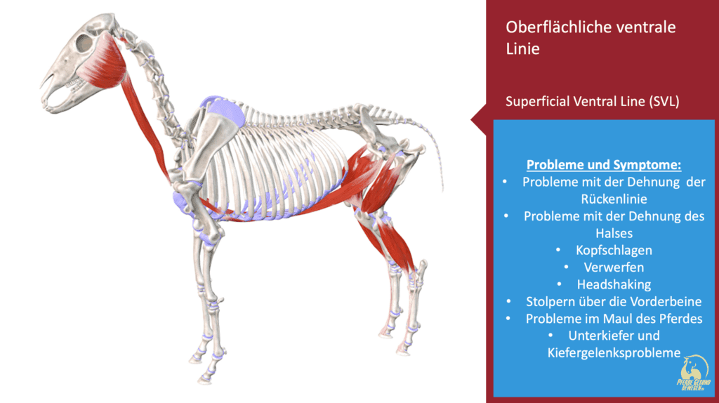 Die Muskeln, die für das Öffnen des Mauls zuständig sind, sind direkt verbunden mit dem Nacken, mit dem Brustbein, und den Schultern. Wir sehen hier eine funktionale “Kette” die sich aus dem Maul über den Rücken bzw. den Bauch bis zur Hinterhand des Pferdes erstreckt.