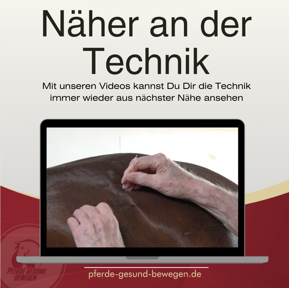 Der Kurs ist ja eine reine Theorievermittlung, die zwar ideal auf die Anwendung in der Praxis vorbereitet und in dem wir Praxis bestmöglich auf Fotos und in Videos “zeigen” – der Vorteil gegenüber einem Praxisseminar -> alle Demonstrationen kannst Du dir immer wieder ansehen. Die kontrollierte erstmalige Anwendung der Nadeln am Pferd können wir selbstverständlich online nicht ersetzen!