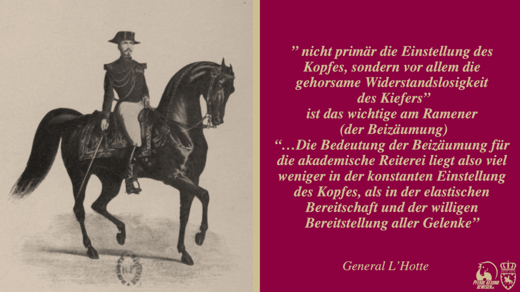 “nicht primär die Einstellung des Kopfes, sondern vor allem die gehorsame Widerstandslosigkeit des Kiefers” ist das wichtige am Ramener (der Beizäumung) “…Die Bedeutung der Beizäumung für die akademische Reiterei liegt also viel weniger in der konstanten Einstellung des Kopfes, als in der elastischen Bereitschaft und der willigen Bereitstellung aller Gelenke”