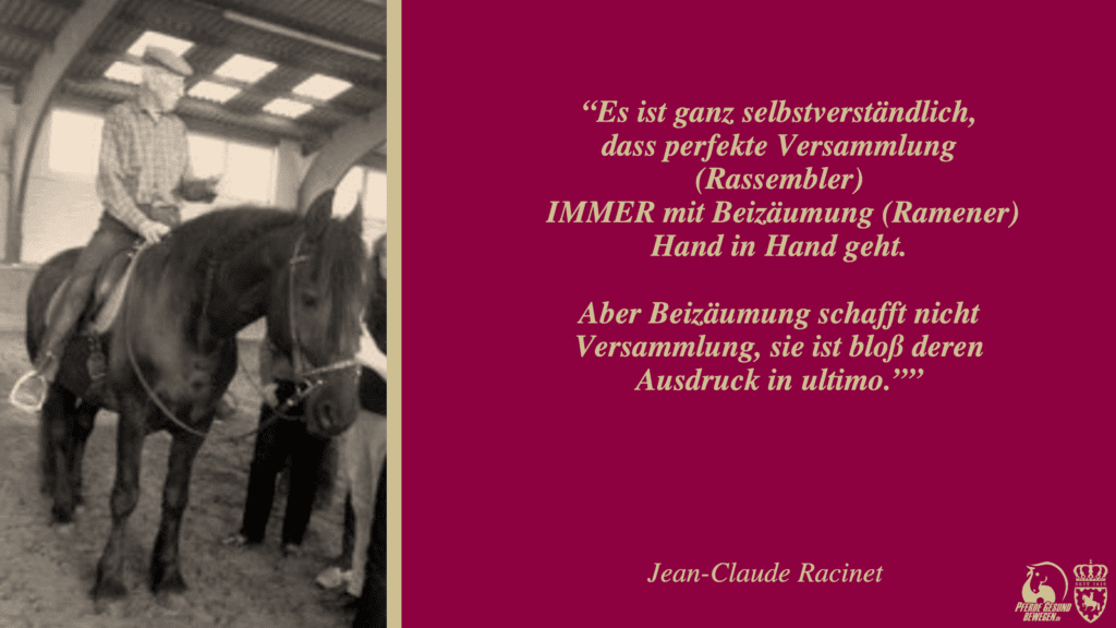 “Es ist ganz selbstverständlich, dass perfekte Versammlung (Rassembler) IMMER mit Beizäumung (Ramener) Hand in Hand geht. Aber Beizäumung schafft nicht Versammlung, sie ist bloß deren Ausdruck in ultimo.”